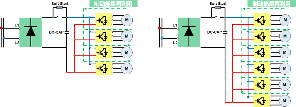 2、共直流母线设计 降低制动频次 实现能耗节省